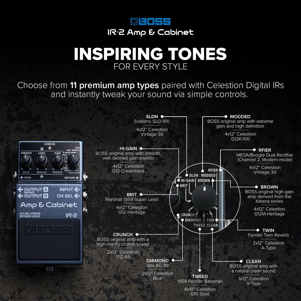 Boss IR-2 Amp and IR Cabinet PedalAmp Sim IR Cabinet Pedal with 11 AmplifiersCelestion-powered IRsMono/stereo Loop,Headphone JackIR Loader