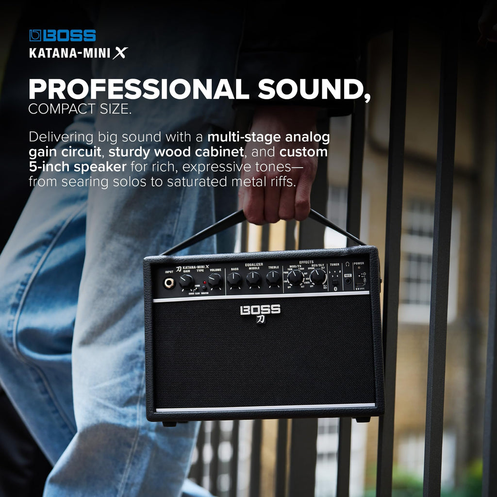- BOSS Katana-Mini X | Powerful 10-Watt Mini Amplifier for Electric, Acoustic & Bass | Tube Logic Design | Custom 5” Speaker | Versatile Sounds & Dual Effects | Bluetooth | Built-in Rechargeable Battery