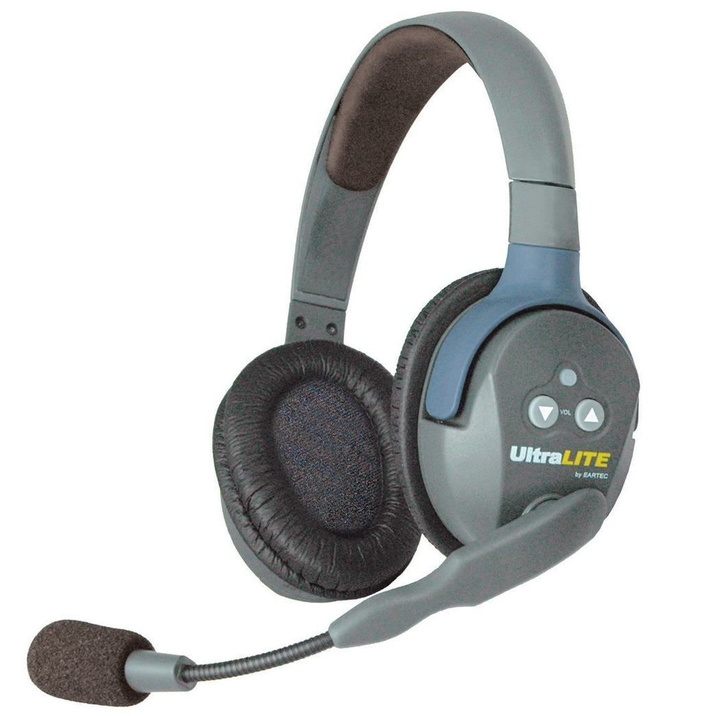Hub Mini Duplex Base Station The HUB is a wearable Mini Base that expands the capacity of UltraLITE wireless headsets for larger crews that need to communicate and work with their hands. This compact transceiver weighs only 4oz and can either be placed strategically on location or belt worn. When clipped comfortably to the user's waist it moves seamlessly with your group allowing UltraLITE headsets to remain connected in full duplex. The HUB can be used as the seventh full duplex transceiver with addition of an Eartec plug-in headset. Full Duplex for up to 7 1/4 mile range in all directions 2 channels of communication Clips to waist - plug-in headset Provides total mobility and increases system capacity to 7. DECT technology Digital enhanced cordless telecommunications. Dual power option Use rechargeable Lithium battery or AC wall plug. Both included. Lithium-ion batteries Provide continuous 6 hour operation. No FCC licensing Ready to go right out of the box. Single Headset UltraLITE Single headsets eclipse all other full duplex wireless for performance and convenience because the transceiver is built right inside the ear cup. This self-contained, "All in One" design eliminates headset wires and even belt worn radios. They provide simultaneous talk, two way voice communication for users that need to work with their hands yet als