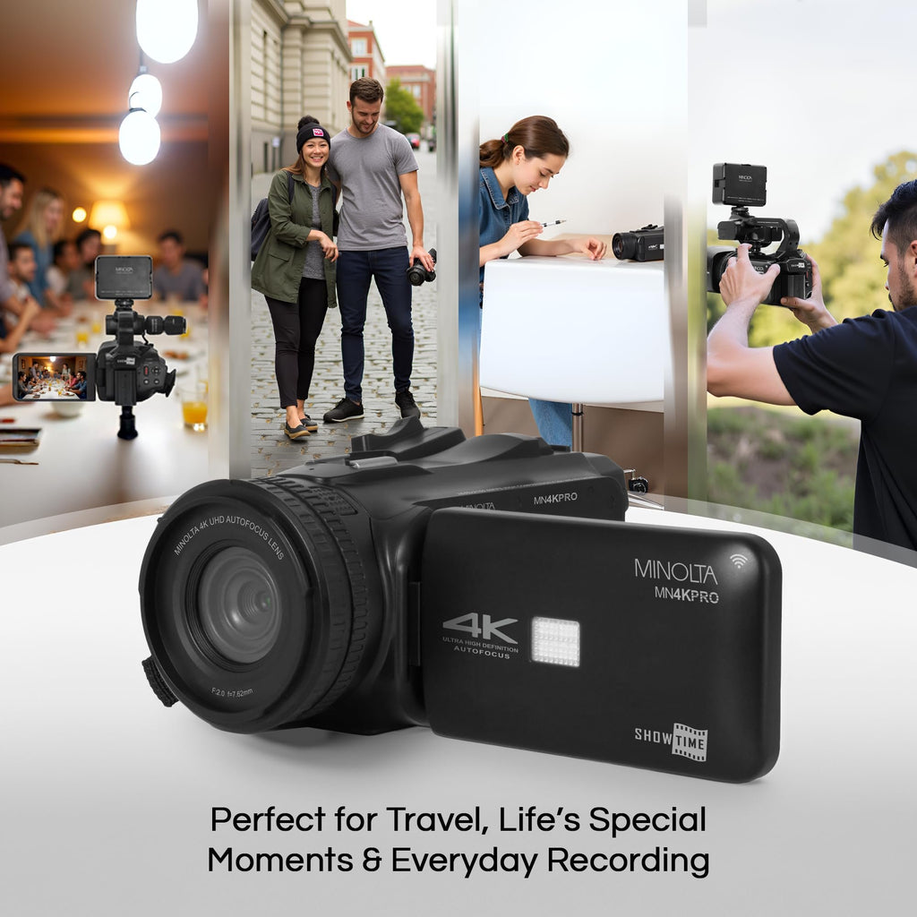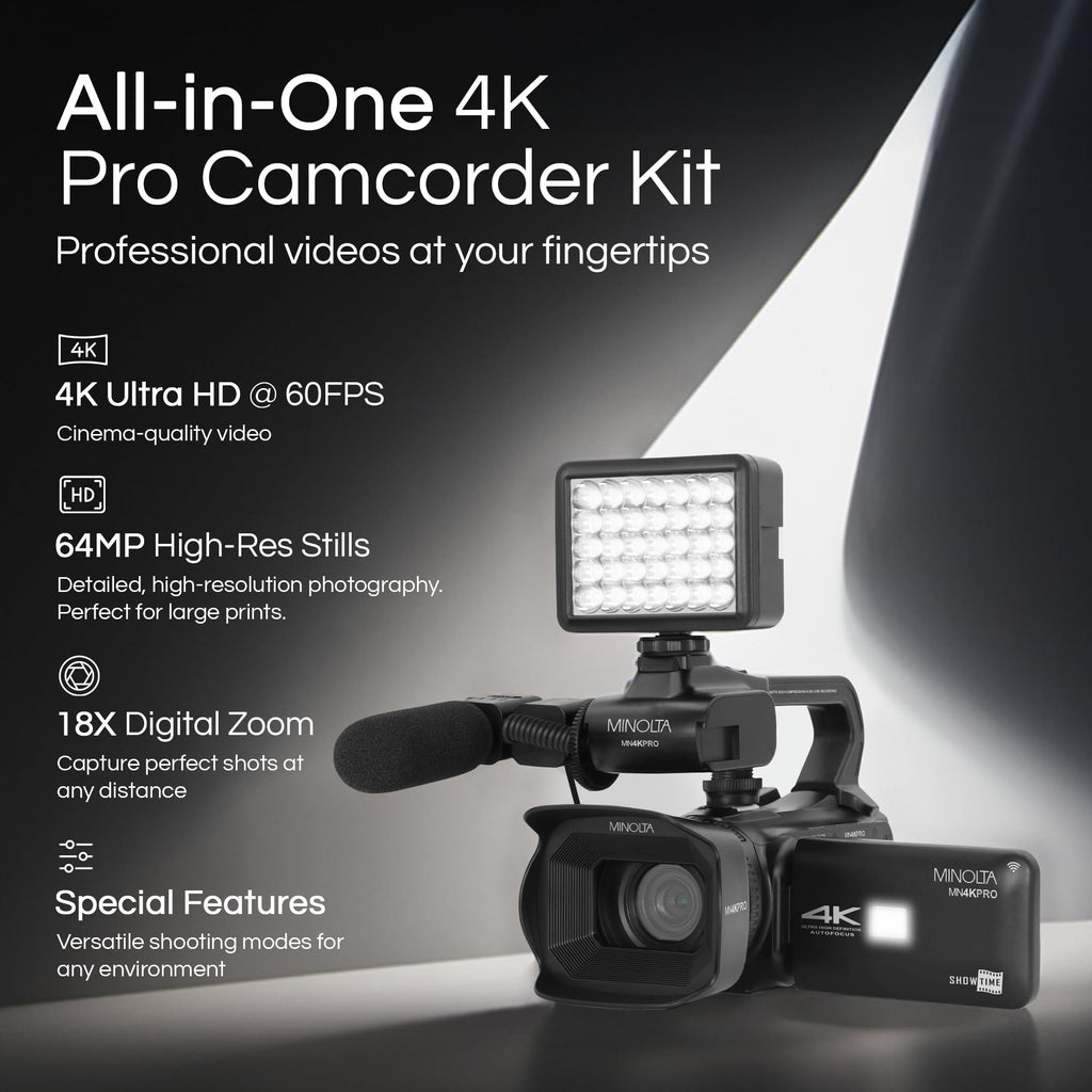Minolta 64MP Autofocus Video Camera with Microphone & Video Light, 4" Touchscreen, 4K Ultra HD Video, 18x Digital Zoom, WiFi, Stabilizer, 32GB Card, 3100mAh Battery, Carrying Bag (Black)COMPLETE PACKAGE: Enhance every shoot with a lens hood, handheld stabilizer, LED video light, and stereo microphone. This all-in-one kit provides the tools needed to produce professional-grade videos from the start.PROFESSIONAL 4K VIDEO & 64MP IMAGES: Shoot in stunning 4K Ultra HD at 60 frames per second and capture brilliant 64MP stills. Ideal for professional content creation, events, or travel, offering crisp visuals with exceptional clarity.ADVANCED FEATURES: Explore creative tools like Time Lapse, Long Exposure, Interval Photo, Slow Motion, and Self Timer. Combine flexibility and control to capture cinematic content with minimal post-editing.EXTENDED RECORDING POWER: The included 3100mAh rechargeable battery offers long-lasting power, letting you film uninterrupted for extended sessions. Great for interviews, live events, or long-form video shoots.BUILT-IN WIFI FOR SMART CONTROL: Easily connect your camcorder to your smartphone via WiFi. Control recording, preview footage, or transfer files wirelessly using the companion app—perfect for real-time content creation.
