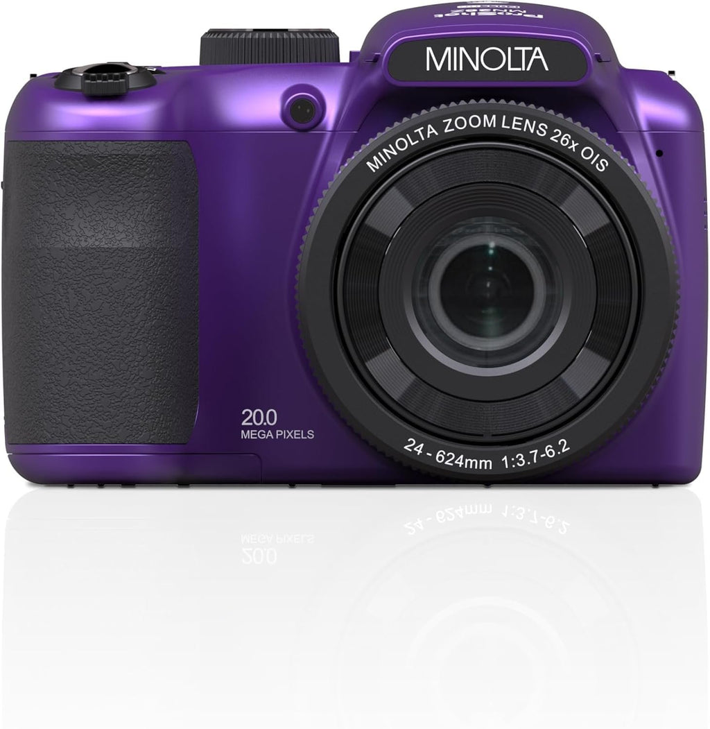 - Minolta ProShot 20MP Camera – 26x Optical Zoom Lens, 1080p HD Video, WiFi, 3-inch LCD Screen, Image Stabilization, Face Detection, Scene Modes, Compact Point & Shoot, 32GB Card (Purple)