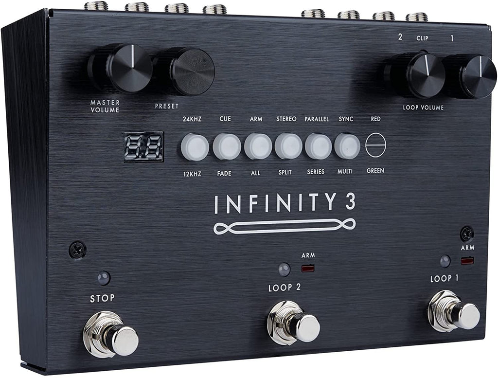 Pigtronix's Most Expressive Looper Pedal Yet Equal parts performance tool and songwriter's sketchbook, the Pigtronix Infinity 3 looper pedal is destined to become a permanent part of your live, rehearsal, and studio workflow. With this next-level looper, you can harness two independent stereo or split mono loops to toggle verse/chorus accompaniment in a live setting. Each loop includes its own level control, so you can build dynamic mixes based on the way you play. You can also pull from a bank of 50 of your own pre-recorded loops (up to 3 hours in total length) to access instant inspiration anywhere you write or play out. As with all Pigtronix pedals, the Infinity 3 looper spares no expense when it comes to features or signal path. Plus, 24-bit/48kHz stereo recording with discrete analog limiter stages and a transparent analog audio pass-through makes this pedal every ounce as choosy as your boutiqueDual Looper Pedal with Stereo Ins Outs24-bit/48kHz Recding3 Hours of Recd Time50 Recallable Loops