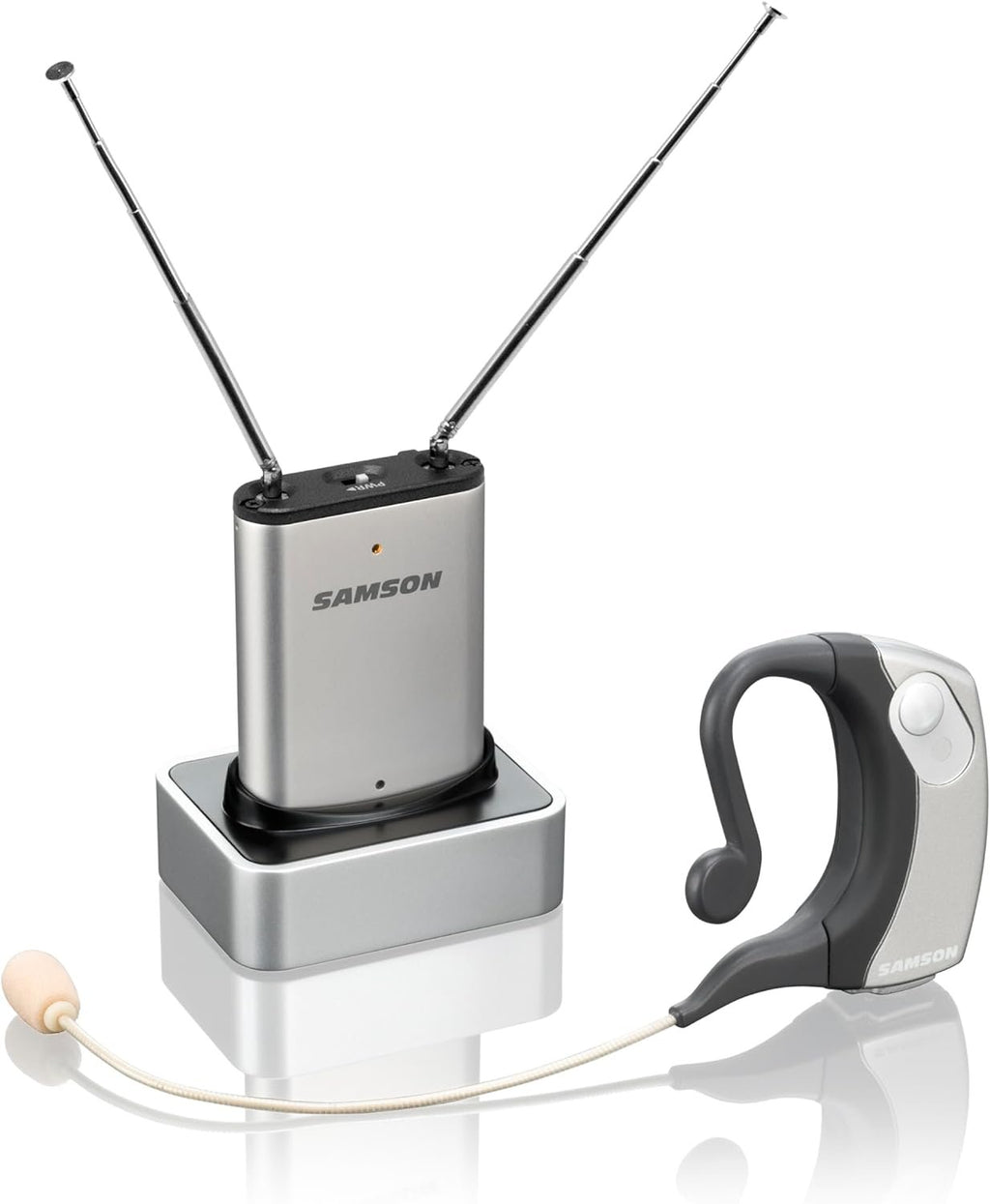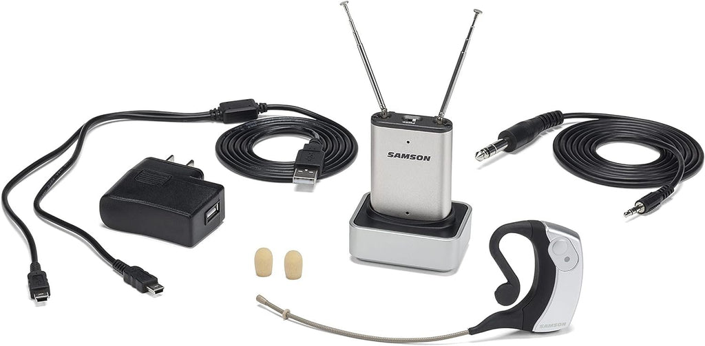 The Samson AirLine Micro Earset Wireless System is a revolutionary solution that delivers exceptional sound quality in a discreet, ultra-compact design. This system includes the innovative AH2 miniature, sweat-proof earset transmitter that fits securely and comfortably in one ear. Powered by a rechargeable battery, the AH2 allows you to move with confidence for up to 10 hours on a single charge. The AirLine Micro features high-quality audio components and an omnidirectional microphone for clear, amplified speech in any situation. The AR2 micro-receiver is incredibly compact and perfect for fixed installations and mobile sound systems. Its 3.5 mm output connects directly to mixers, PA systems or even portable speakers. The internal rechargeable battery provides up to six hours of operation on a single charge, making it ideal for performances where there is no access to a power outlet. The AirLine Micro is designed for reliable performance. A tone button and auto-mute circuitry eliminate unwanted noise and interference, ensuring your voice is heard loud and clear. Performers, presenters and fitness instructors, free yourself from bulky belt packs and tangled cords and unleash your full potential.Includes AH2 Micro Ear set Transmitter, AR2 Micro Receiver, AR2D Receiver Dock, USB Y-Power Cable, 1/8" to 1/4" Audio Cable, 3 Windscreens and Carry CaseTone key and auto mute prevents unwanted noise when transmitter is off or out of rangeAH2 Ear set transmitter built-in rechargeable battery provides up to 6 hours of operationAH2 Ear set transmitter features one button operation for power, mute and volumeAr2 receiver Built-in rechargeable battery provides up to 6 hours of operationAr2 receiver Includes 1/8" (3. 5mm) unbalanced mic/line level output300' Operating range (line-of-sight)