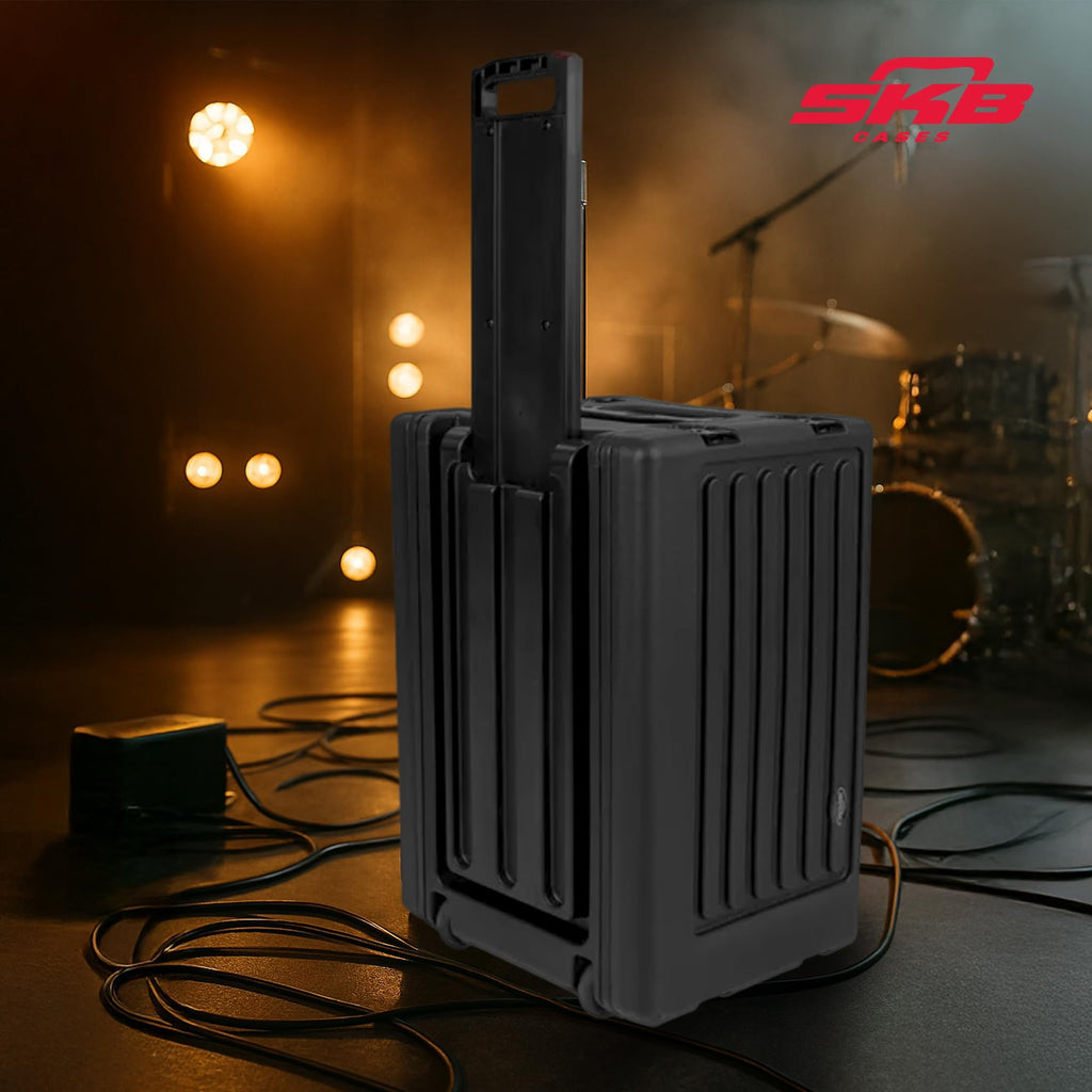 - SKB 6U rSeries Shallow Rolling Rack with Integrated Back Wheels and 1-Touch Pull Handle, Comes with 8 Rack Units and Interlocking Molded Stacking Bars