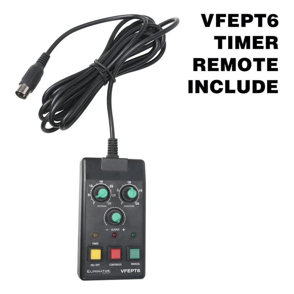 - Reheating Time: 15 Seconds Second Fog Shooting Time: Around 12 Seconds Output: 20,000 cubic ft. per min Fog fluid tank: 2.3 Liter (non-removable) Includes the VFEPT6 timer wired remote